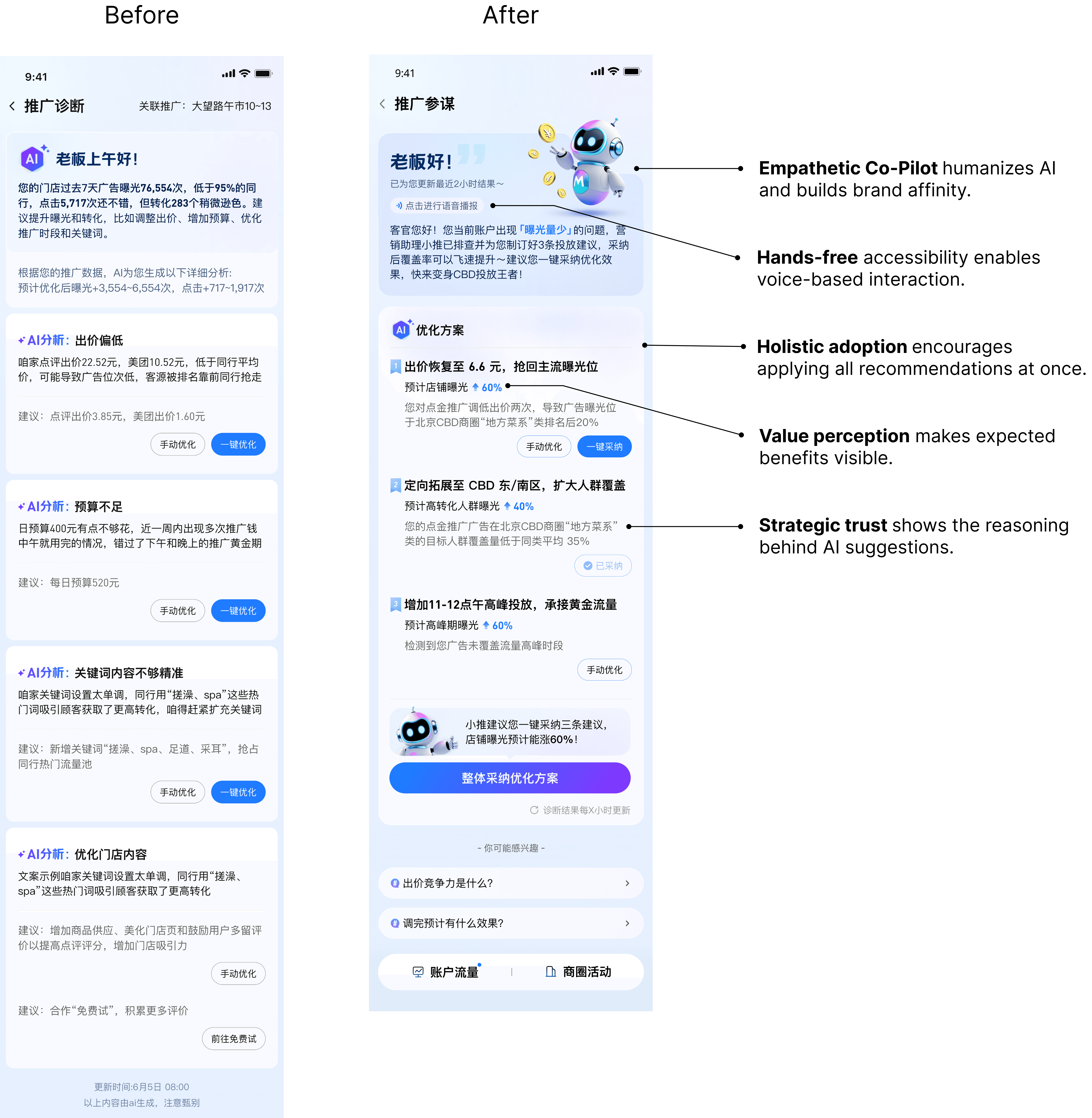 The project focused on using AI and multi-dimensional data to generate personalized advertising recommendations for merchants. I drove the end-to-end design from 0 to 1 MVP launch through subsequent iterations, covering the full funnel including entry exposure, AI insights presentation, conversational interaction, and decision-making for recommendation adoption.